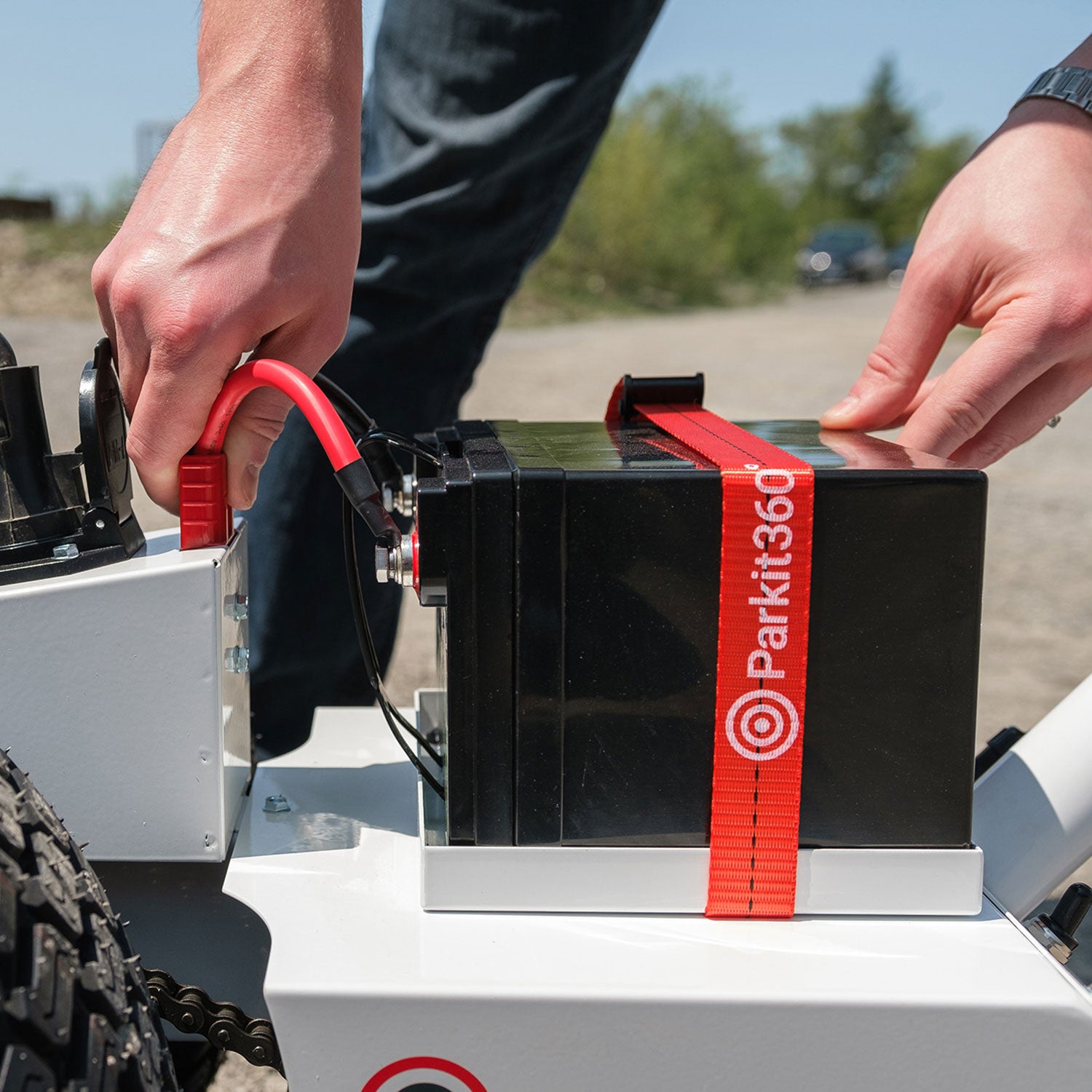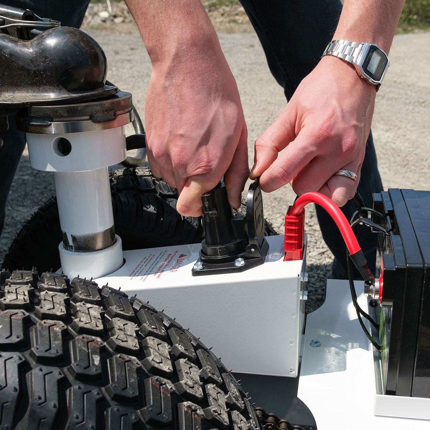 Our dollies come with a U1 Battery Kit, but can alternatively be powered by any Group 24, 12-V Deep Cycle or Marine Battery, or tethered to your trailer’s batteries with an 80” cable.