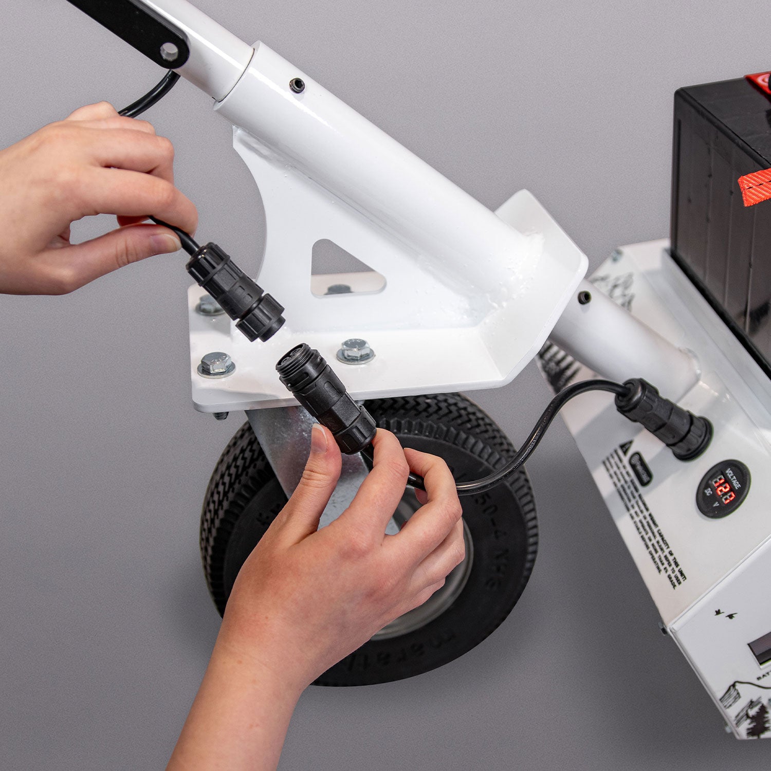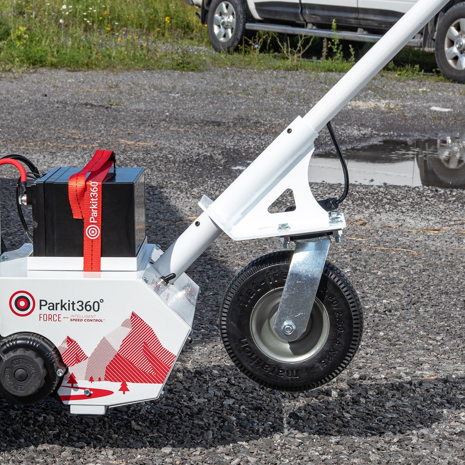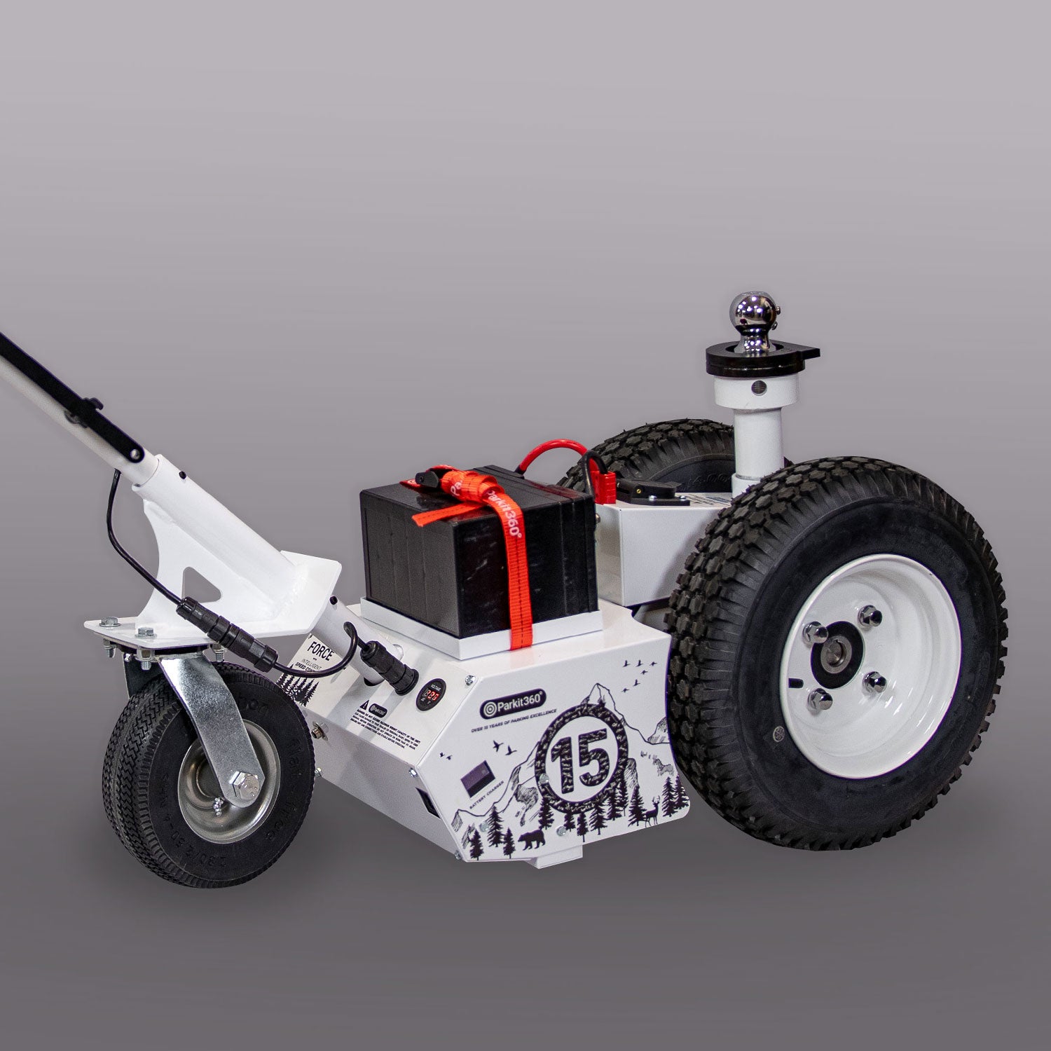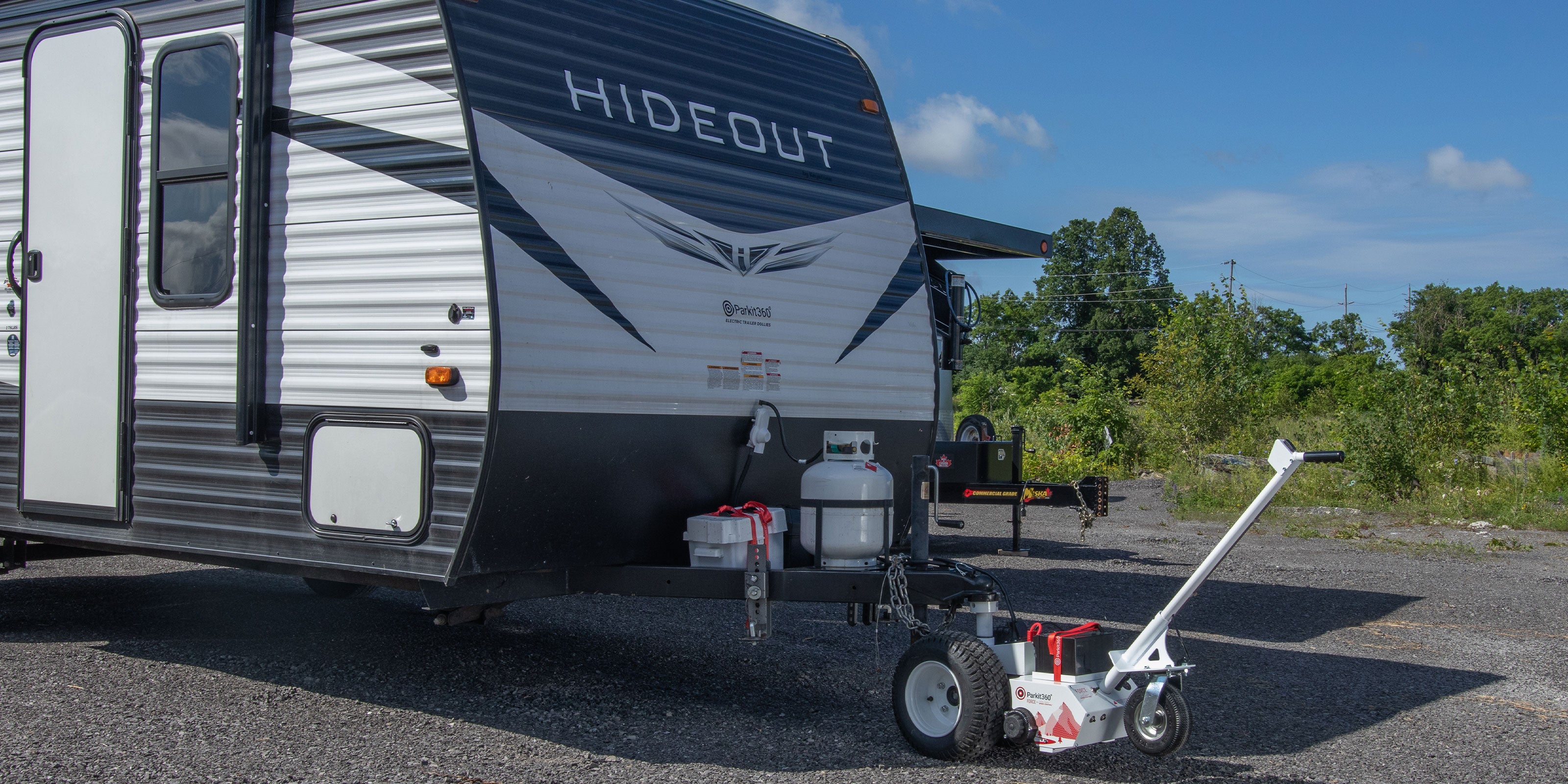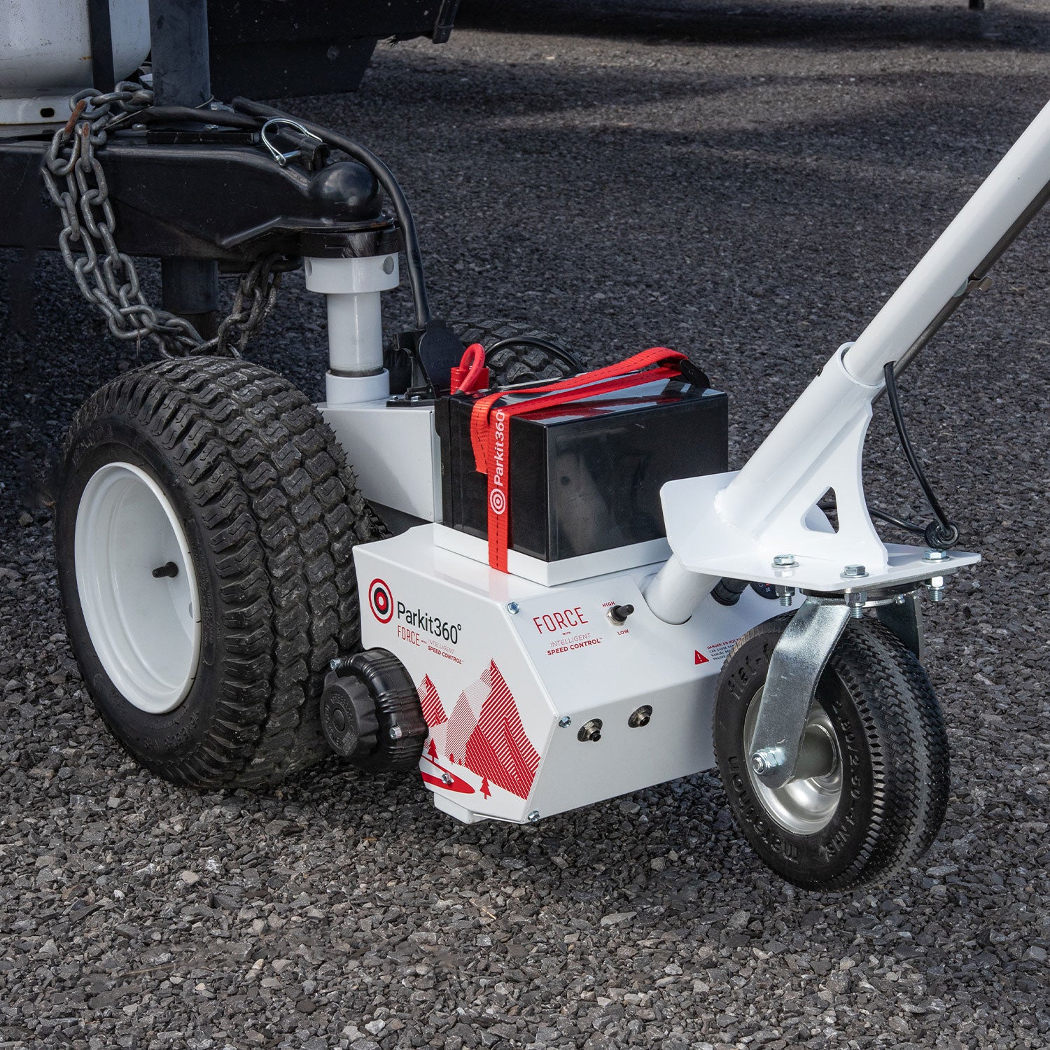 Once your trailer connection is secured, the wheel will hover off of the ground, allowing the Force trailer dolly to move over varying terrains and grades with ease!